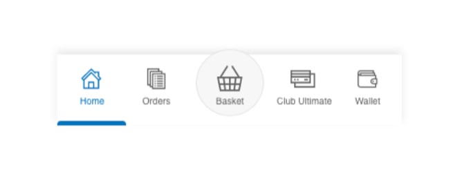 The primary navigation of the product consists of Home, Orders, Basket (incomplete or new order), ClubUltimate and Wallet.